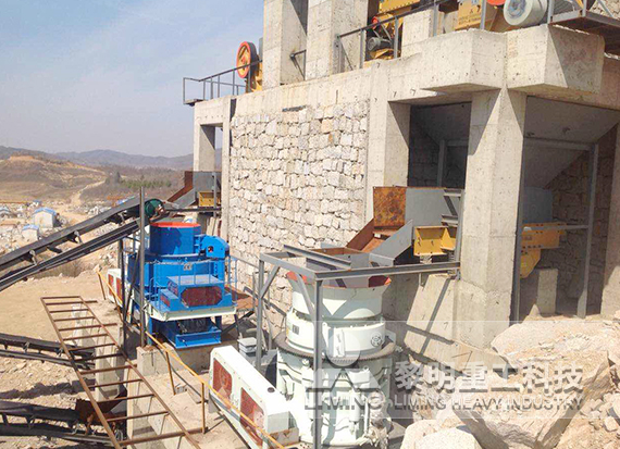 大塊物料經(jīng)過GZD1500×6000振動(dòng)給料機(jī)被均勻的送進(jìn)HJW145高能顎破中進(jìn)行粗碎;粗碎后的物料經(jīng)過兩臺(tái)GZD960×3800振動(dòng)給料機(jī)進(jìn)入兩臺(tái)HJ98高能顎破中進(jìn)行中碎;中碎后的物料經(jīng)過兩臺(tái)GZD960×3800振動(dòng)給料機(jī)均勻的喂入兩臺(tái)HPT300多缸液壓圓錐破進(jìn)行細(xì)碎;細(xì)碎后的物料經(jīng)過三臺(tái)YZS2160振動(dòng)篩分級后,10-25mm成為骨料產(chǎn)品,25mm以上的返回HPT300多缸液壓圓錐破循環(huán)破碎,0-10mm的物料進(jìn)入VSI9526沖擊破進(jìn)行整形,產(chǎn)出0-5mm的成品機(jī)制砂。