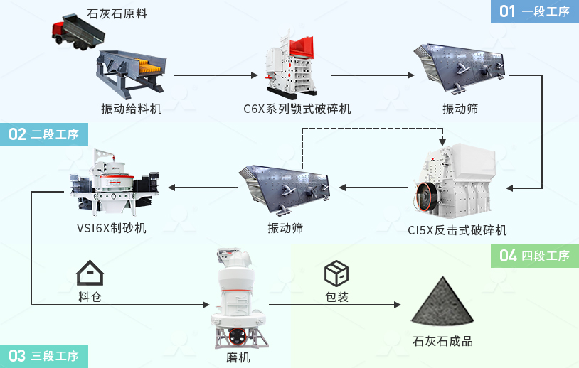 第三階段:磨粉破碎后的石灰石小塊物料經(jīng)提升機送至料倉,再經(jīng)振動給料機將其均勻定量的送入磨機研磨室內(nèi)進行研磨。