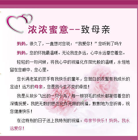 在這特別的日子送上我特別的祝福:母親節(jié)快樂!媽媽,我永遠愛你!