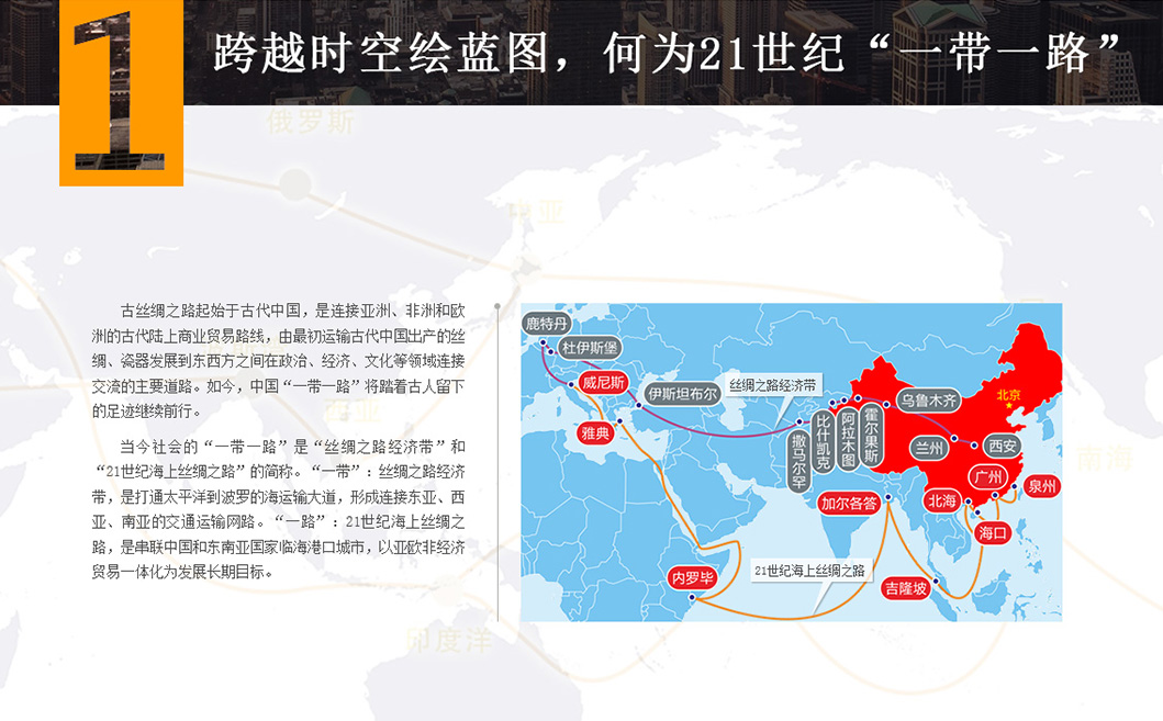 當(dāng)今社會(huì)的“一帶一路倡議”是“絲綢之路經(jīng)濟(jì)帶”和 “21世紀(jì)海上絲綢之路”的簡(jiǎn)稱。“一帶”:絲綢之路經(jīng)濟(jì)帶,是打通太平洋到波羅的海運(yùn)輸大道,形成連接?xùn)|亞、 西亞、南亞的交通運(yùn)輸網(wǎng)路。“一路”:21世紀(jì)海上絲綢之路,是串聯(lián)中國(guó)和東南亞國(guó)家臨海港口城市,以亞歐非經(jīng) 濟(jì)貿(mào)易一體化為發(fā)展長(zhǎng)期目標(biāo)。