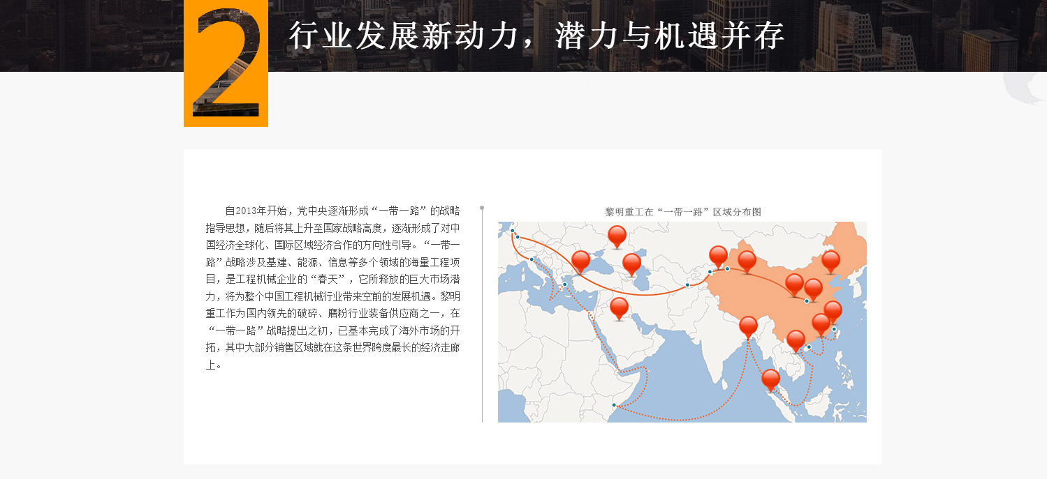自2013年開(kāi)始,黨中央逐漸形成“一帶一路倡議”的戰(zhàn)略指導(dǎo)思想,隨后將其上升至國(guó)家戰(zhàn)略高度,逐漸形成了對(duì)中國(guó)經(jīng)濟(jì)全球化、國(guó)際區(qū)域經(jīng)濟(jì)合作的方向性引導(dǎo)。“一帶一路倡議”戰(zhàn)略涉及基建、能源、信息等多個(gè)領(lǐng)域的海量工程項(xiàng)目,是工程機(jī)械企業(yè)的“春天”,它所釋放的巨大市場(chǎng)潛力,將為整個(gè)中國(guó)工程機(jī)械行業(yè)帶來(lái)發(fā)展機(jī)遇。黎明重工作為國(guó)內(nèi)知名的破碎、磨粉行業(yè)裝備供應(yīng)商之一,在“一帶一路倡議”戰(zhàn)略提出之初,已基本完成了海外市場(chǎng)的開(kāi)拓,其中大部分銷售區(qū)域就在這條世界跨度最長(zhǎng)的經(jīng)濟(jì)走廊上。