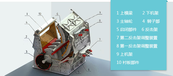由機架部分、轉(zhuǎn)子部分、反擊架、翻蓋裝置和傳動部分組成。工作時,電機高速旋轉(zhuǎn)帶動轉(zhuǎn)子做高速運動。當(dāng)物料由入料口進入機器時,受到轉(zhuǎn)子上的板錘高速撞擊而被破碎,然后被拋到反擊襯板上再次破碎,之后又從反擊襯板上彈回到板錘作用區(qū)重新破碎。在此過程中,物料之間也相互撞擊,達到破碎的效果。此過程重復(fù)進行,直到物料被破碎至所需粒度,由出料口排出。