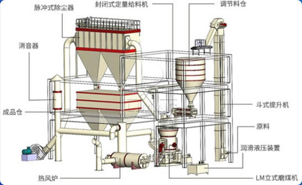 由熱風(fēng)爐出來的熱風(fēng)或廢氣,在系統(tǒng)風(fēng)機(jī)的抽引下,進(jìn)入立式磨煤機(jī),與磨內(nèi)被粉磨的原煤進(jìn)行充分熱交換后,帶起煤粉在分離器處進(jìn)行分選,細(xì)度不合格的粗煤粉重新落到磨盤上進(jìn)行粉磨,合格的煤粉隨氣流進(jìn)入防爆氣箱脈沖收塵器被收集下來,經(jīng)過分格輪卸入煤粉倉(cāng)。